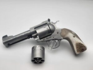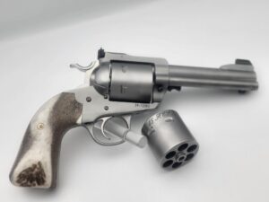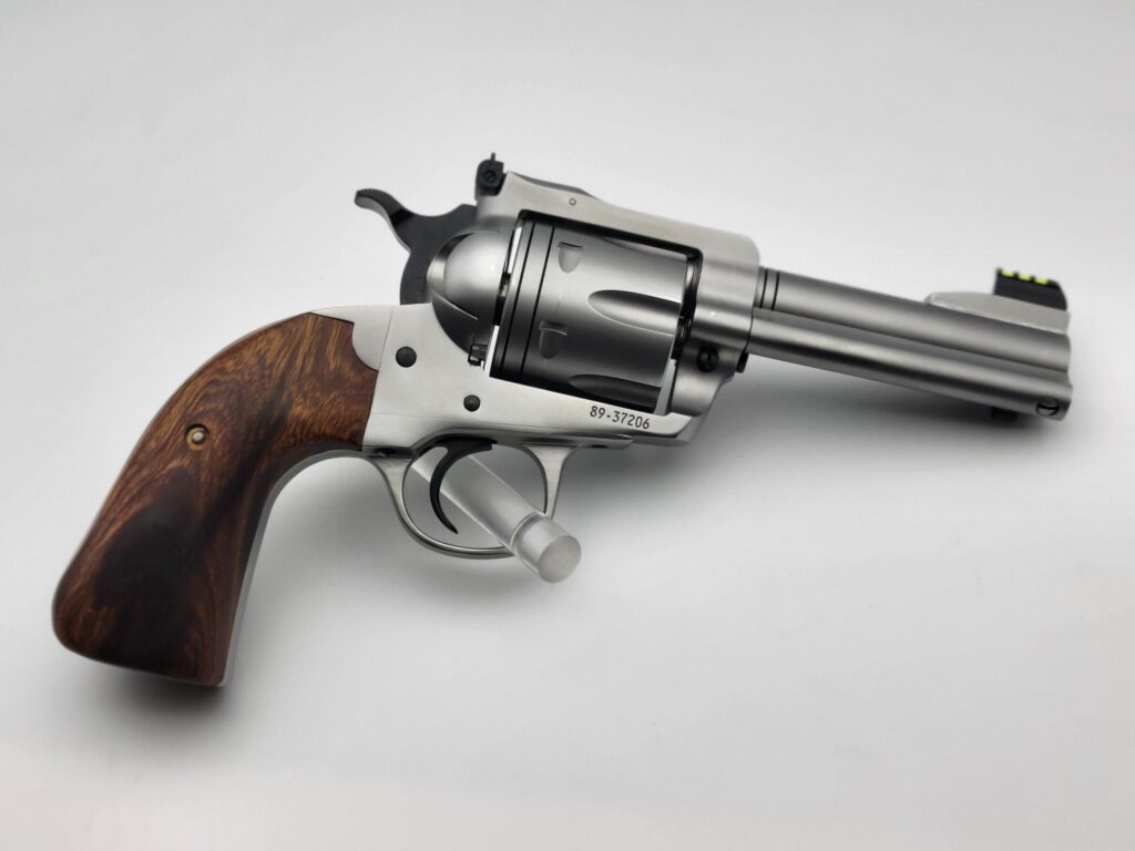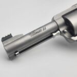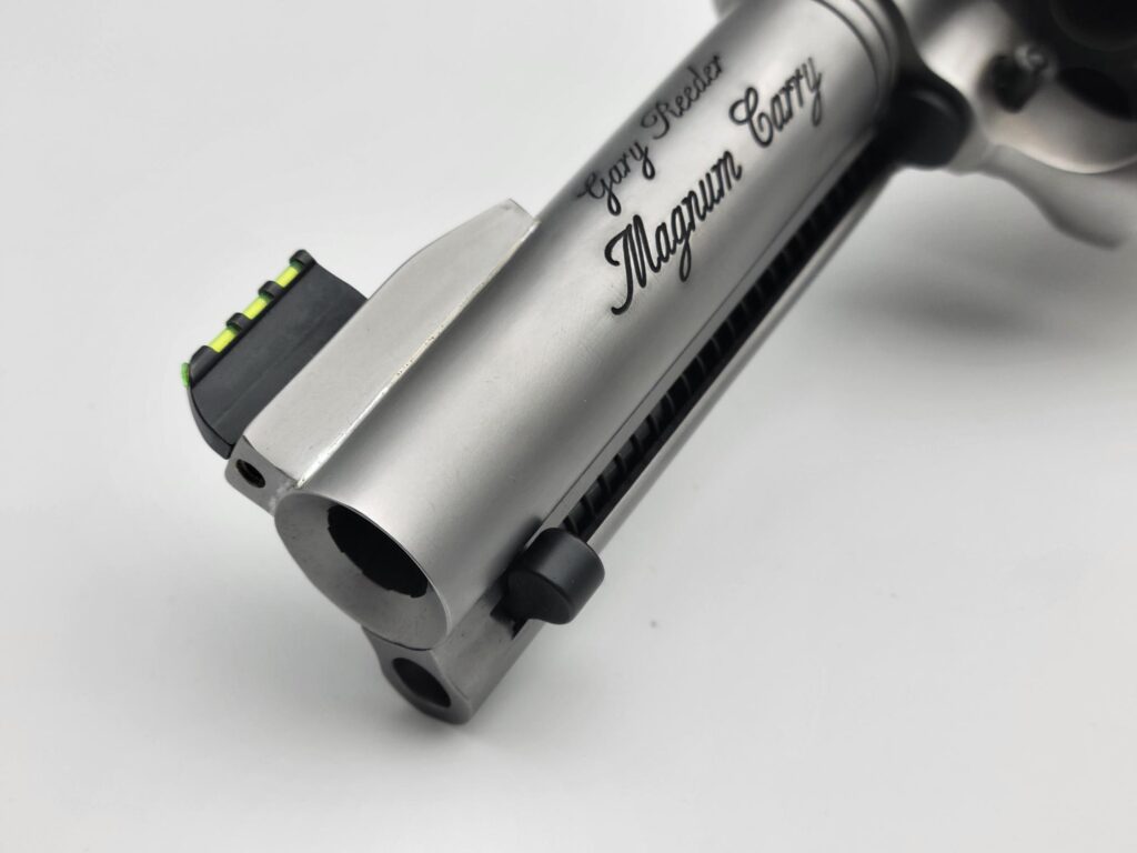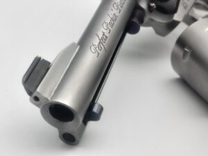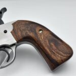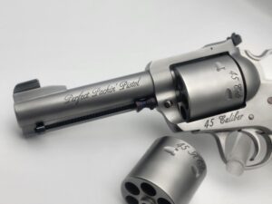 Chambered in 44 Magnum with a 4 5/8" barrel. It comes with a gold bead sight. It is stainless steel with a soft vapor-hone finish and stabilized Elder Lace Burl wood. We have done our Positive Performance Package for accuracy.