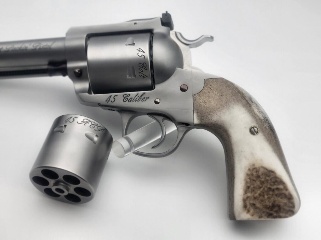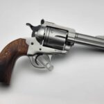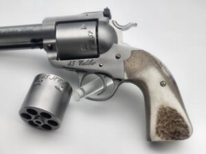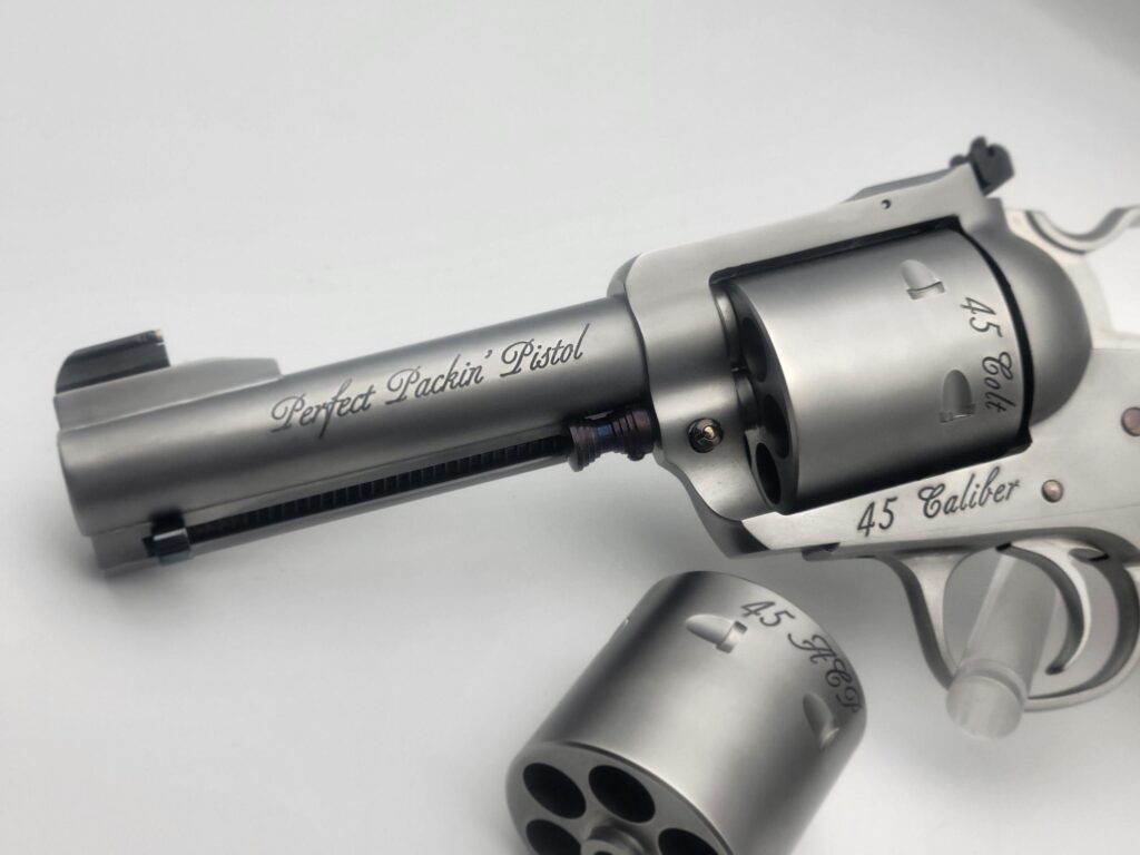 This handsome fellow is chambered in 45 Long Colt with an extra 45 ACP cylinder, giving you a brilliant gun for handgun hunting or just a day at the range. This Perfect Packin' Pistol includes all the options and workmanship needed. Starting with the 4 5/8" barrel, gold bead sight, our gunfighter grip featuring a set of hardy stag grips, and finished with a soft satin vapor hone on this stout stainless steel revolver featuring Nitre Blue accents. Our Positive Performance Package ensures accuracy.